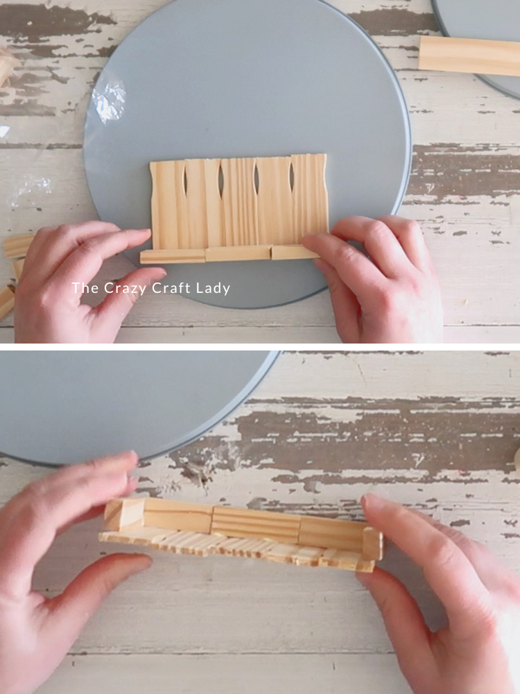 - Build the Mini Wooden Half Crate. Line up five paint stir stick handles side by side to create the front of the crate. Use a combination of wood glue and hot glue, and secure three tumbling tower blocks along the bottom edge using wood glue.