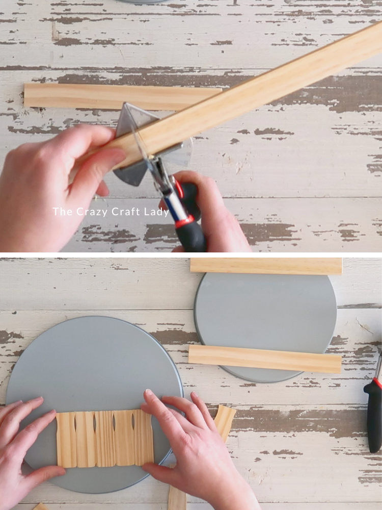 - Cut the Paint Stir Sticks. Using miter shears, trim the handles off two paint stir sticks. Cut both sticks down to the same length. Mark your cut line with a pencil so they match. Tip: Paint stir sticks can be stubborn. Some cut easily, while others take several passes. Just alternate cutting from each direction until they snap through.
