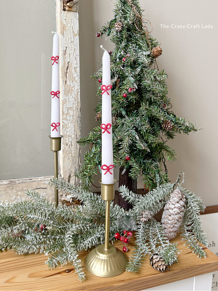 DIY Bow Taper Candles: Make your own Pottery Barn–inspired bow candles for just a few dollars! A simple hot glue and paint project that’s festive and budget-friendly.