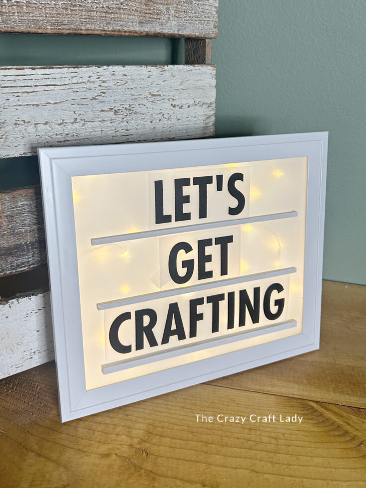 Today I’m sharing how to turn a simple 8×10 Dollar Tree picture frame, a cutting mat, and a shoebox lid into the cutest little DIY light box sign for your craft room. It looks like one of those trendy marquee light boxes… but it’s totally budget-friendly and made with supplies you probably already have.