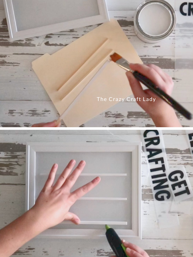 - Attach the Ledges. Place your word strips inside the frame to determine spacing.Once you’re happy with placement, run a thin line of hot glue along the bottom edge of each dowel and secure them in place.