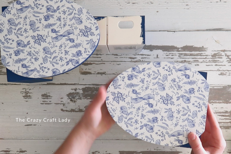 - Prep and Paint the Wooden Eggs. Remove the sticky labels from the backs of the wooden Easter egg cutouts using a heat gun. Paint: the edge of each egg and one flat surface. Use the same color you painted the crates (navy in my case). Leave the opposite flat surface unpainted for now. We’ll decorate that in the next step.