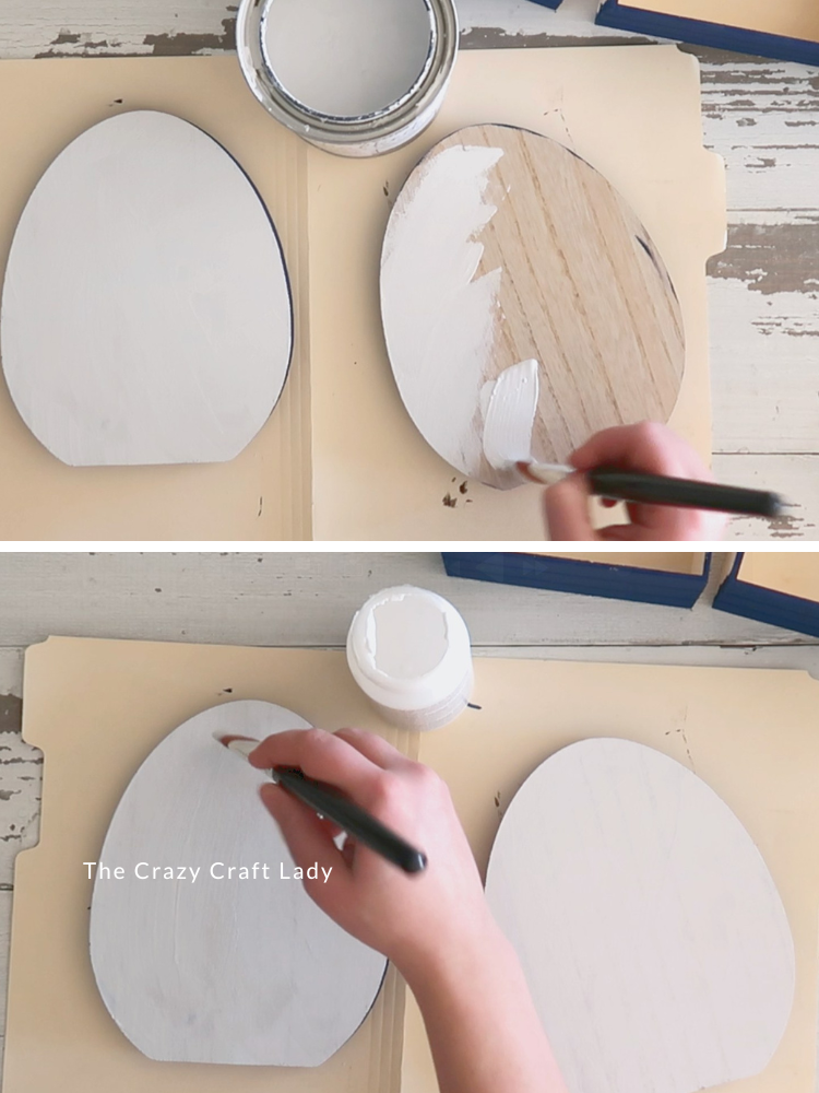 - Paint the Front of the Eggs. Paint the front surface of each egg with white chalk paint. Use brush strokes that move from the center outward so you get a clean edge against the painted border. Allow the paint to dry. Then apply a generous coat of Mod Podge over the white surface. Let the Mod Podge dry completely before moving on.
