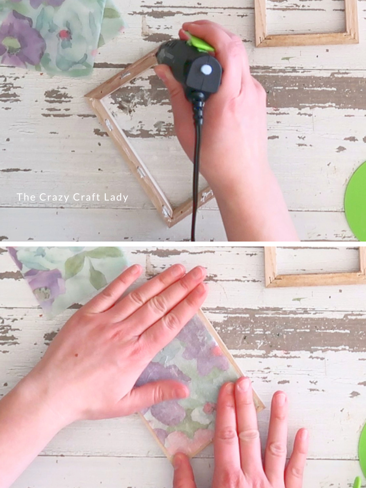 - Attach Panels to Frames. Flip each wooden frame over (staple side up). Apply hot glue around the edges, then press your plastic panel into place: Plastic side faces outward, napkin side faces inward. Work quickly so the glue doesn’t harden before placement. Repeat for all four frames.