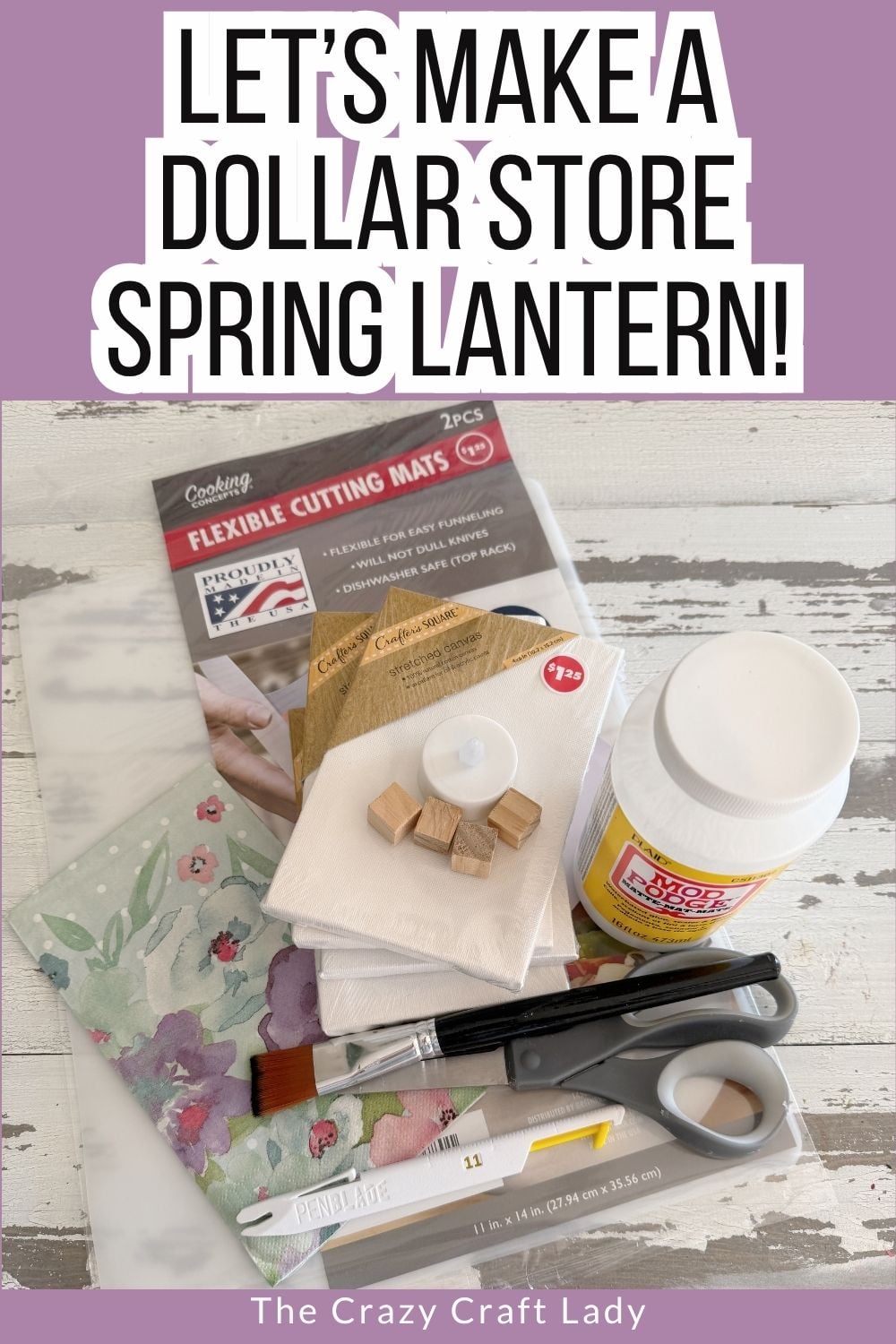 Turn mini canvases into a cute little DIY lantern with this easy Dollar Tree craft using floral napkins and a chopping mat.