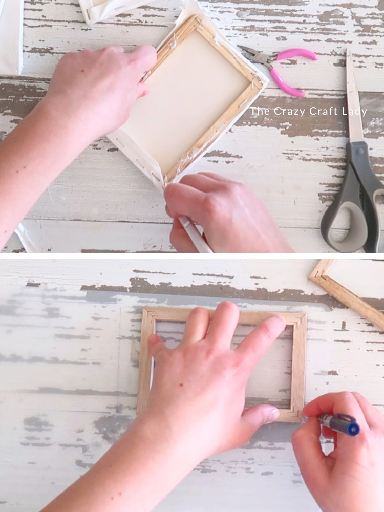 - Disassemble the Canvases. Start by removing the plastic wrapping from your mini canvases. Then carefully cut and peel away all the canvas fabric.. Take your time here, and use a craft knife or scissors to trim around the edges until you’re left with just the bare wooden frames.
