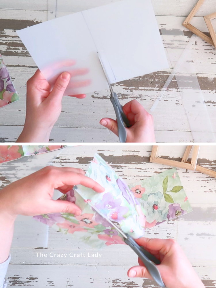 - Prep the Napkin Design. Separate your paper napkin layers. You only want the top printed layer. Cut four pieces of napkin slightly larger than your plastic rectangles.