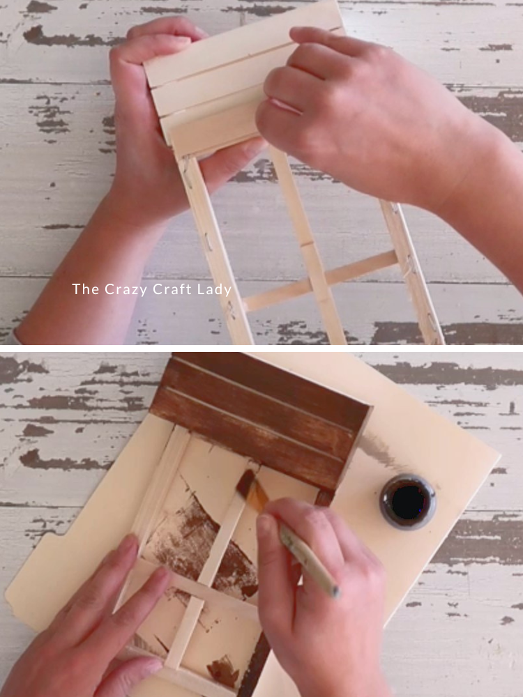 - Attach Frame to Crate. Hot glue the wooden frame to the back top edge of the mini wood crate. Cut a jumbo popsicle stick to the width of the frame and glue it along the seam between the crate and the window to help it stand upright.