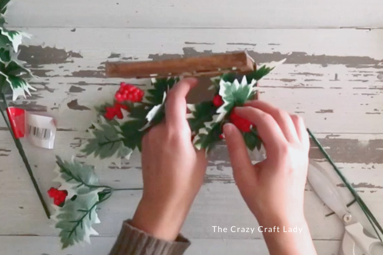 - Create the Floral Arrangement. Trim faux winter greenery and berry sprigs and arrange them inside the crate. No foam needed, just tuck them snugly into place.