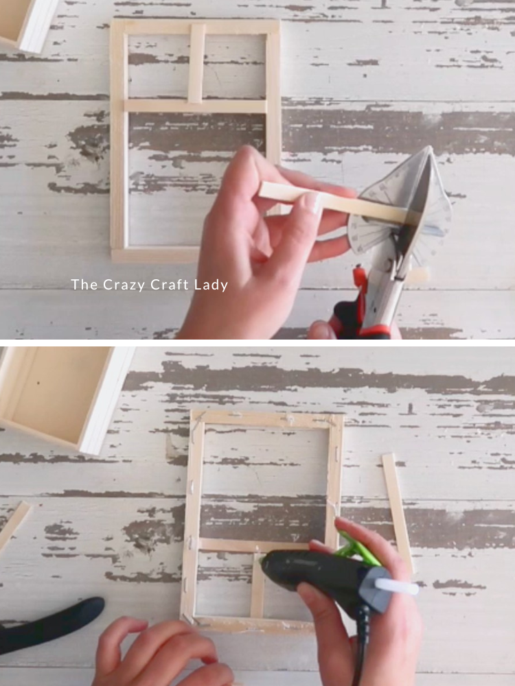 - Add Window Panes. Using miter shears, cut popsicle sticks to form a vertical and horizontal cross inside the frame. Hot glue them neatly to the front of the frame so the front looks clean and finished. Add extra glue on the back for stability.