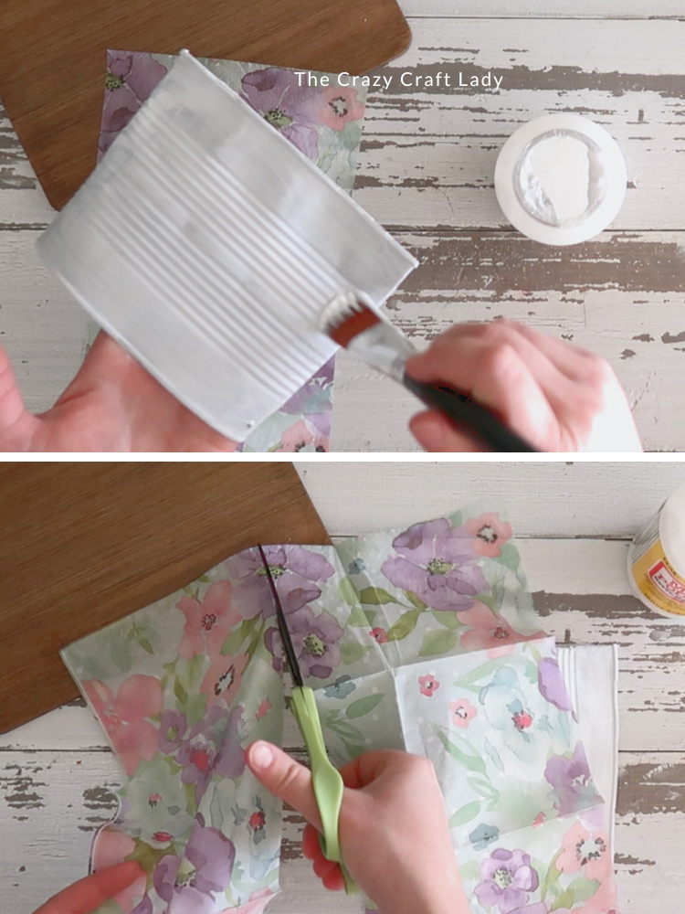- Decoupage the Can. Separate the napkin layers so you’re using just the top printed layer. Brush Mod Podge onto the can, and then gently lay the napkin over the surface. Smooth carefully to avoid tears. Seal with another coat of Mod Podge. Let dry fully.