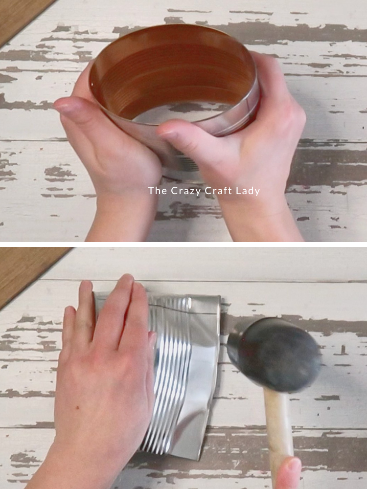 - Prep the Tin Can. Remove both the top and bottom of your can so you’re left with a cylinder. REmove the paper wrapper and any adhesive as well.