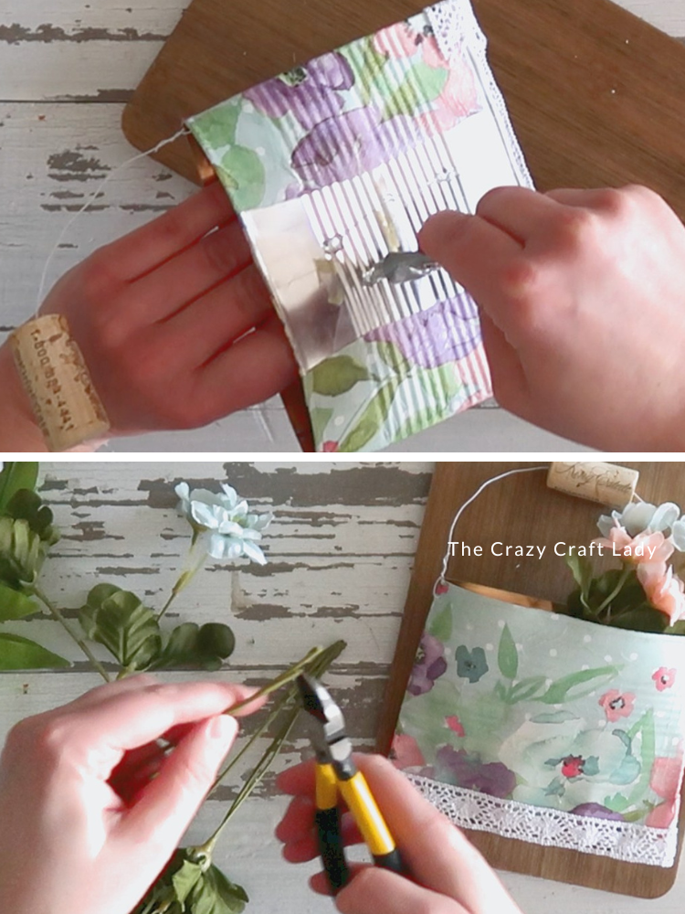 - Create the Handle. Cut two pieces of floral wire and insert them into a wine cork (optional but cute!). Thread each end through the holes in the can and twist to secure. Now you’ve got a charming little handle detail.